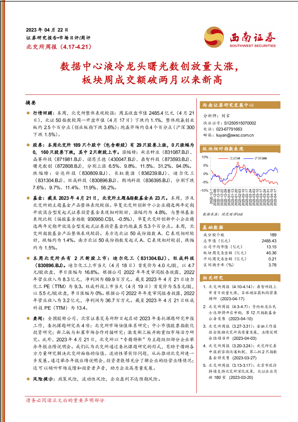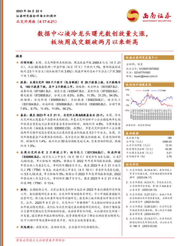 【西南证券】【20230422】北交所周报:数据中心液冷龙头曙光数创放量大涨,板块周成交额破两月以来新高-24页