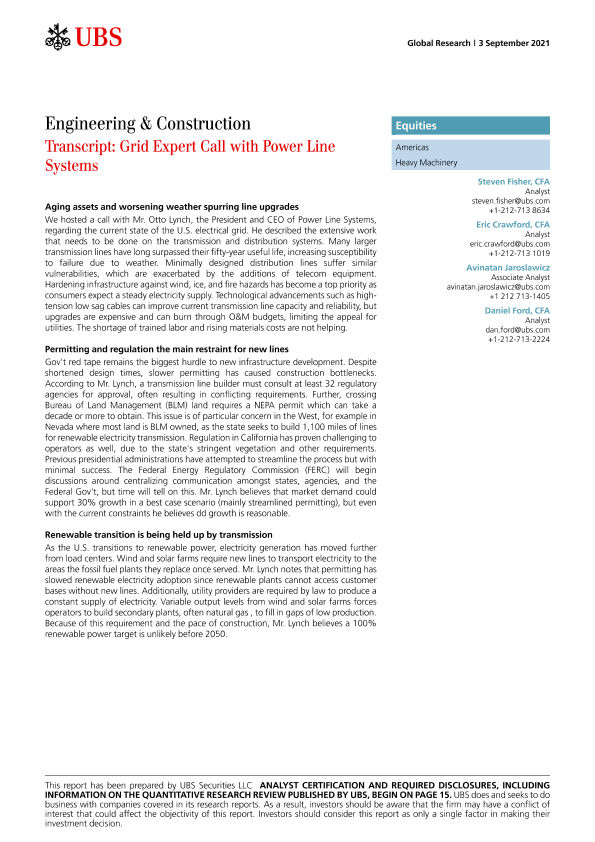【瑞银】【20210903】瑞银-美股重型机械行业-工程与建筑:电网专家与电力线系统的通话记录-22页