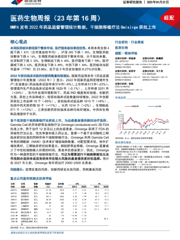 【国信证券】【20230423】医药生物周报(23年第16周):NMPA发布2022年药品监督管理统计数据,干细胞移植疗法Omisirge获批上市-15页