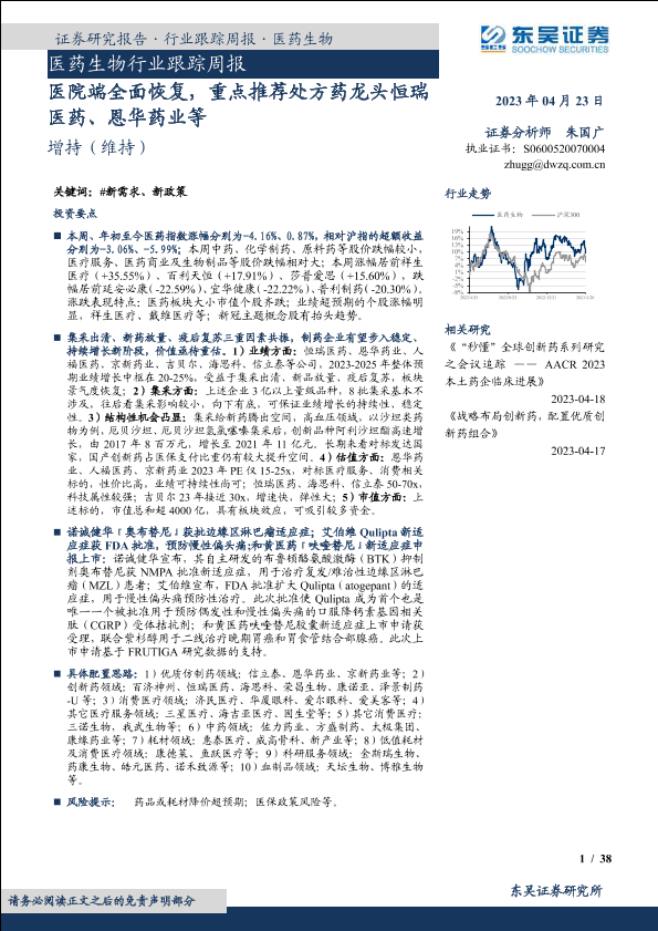 【东吴证券】【20230423】医药生物行业跟踪周报:医院端全面恢复,重点推荐处方药龙头恒瑞医药、恩华药业等-38页