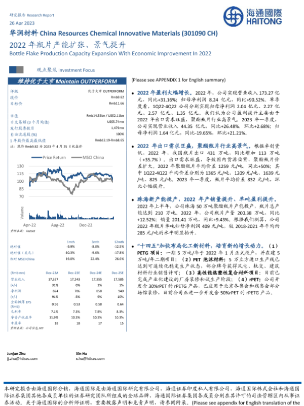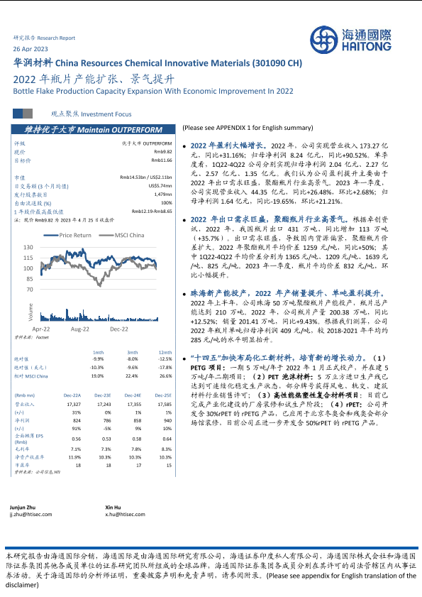 【海通国际】【20230426】华润材料(301090)2022年瓶片产能扩张、景气提升-15页