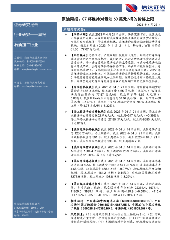 【信达证券】【20230423】原油周报:G7将维持对俄油60美元桶的价格上限-26页