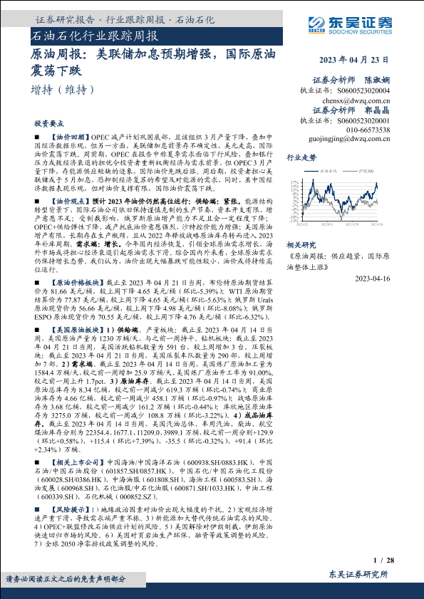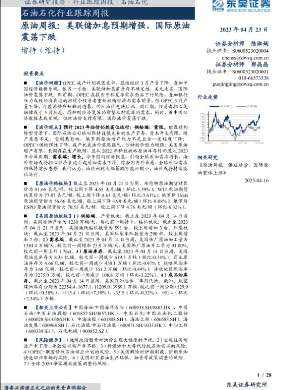 【东吴证券】【20230423】原油周报:美联储加息预期增强,国际原油震荡下跌-28页