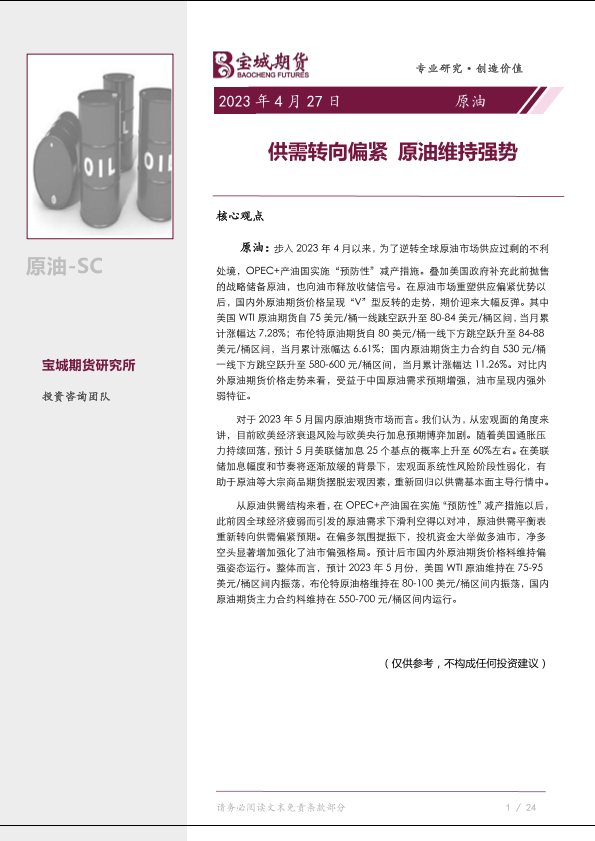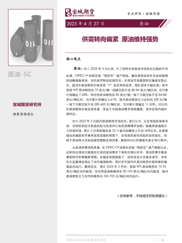 【宝城期货】【20230427】原油月报:供需转向偏紧,原油维持强势-24页