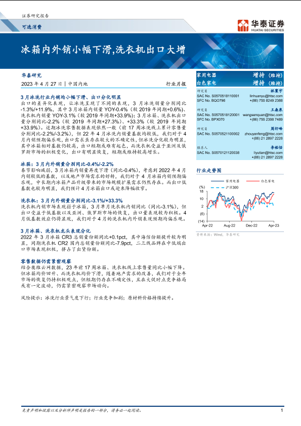 【华泰证券】【20230427】可选消费行业月报:冰箱内外销小幅下滑,洗衣机出口大增-17页