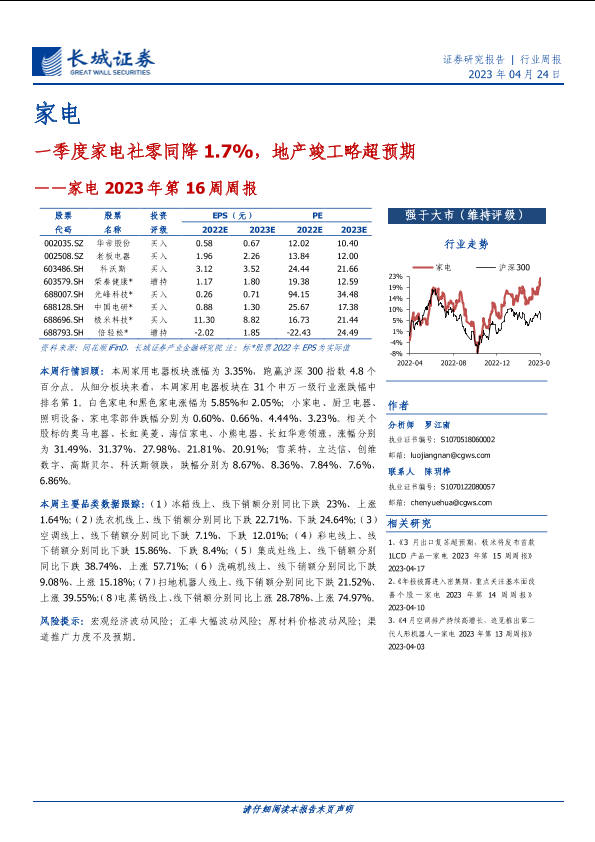 【长城证券】【20230424】家电2023年第16周周报:一季度家电社零同降1.7%,地产竣工略超预期-27页