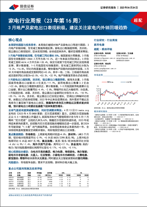 【国信证券】【20230424】家电行业周报(23年第16周):3月地产及家电出口表现积极,建议关注家电内外销回暖趋势-16页