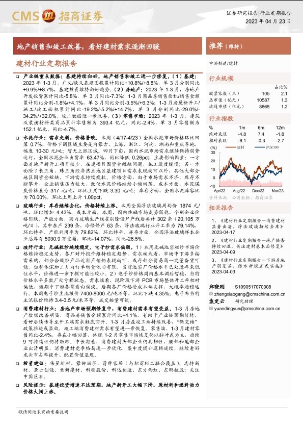 【海通证券】【20230423】建材行业定期报告:地产销售和竣工改善,看好建材需求逐渐回暖-25页
