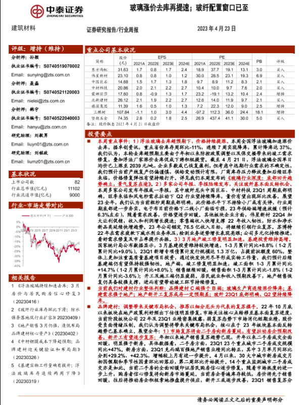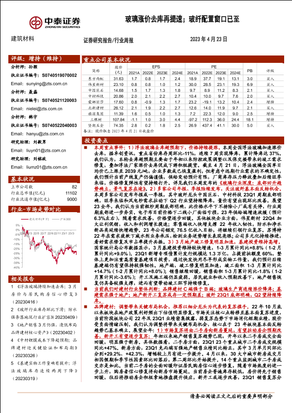 【中泰证券】【20230423】建筑材料行业周报:玻璃涨价去库再提速;玻纤配置窗口已至-24页