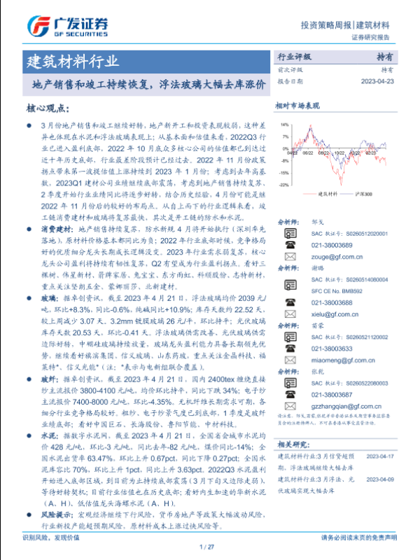 【广发证券】【20230423】建筑材料行业投资策略周报:地产销售和竣工持续恢复,浮法玻璃大幅去库涨价-27页