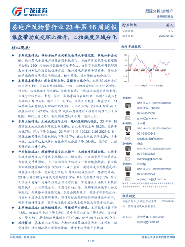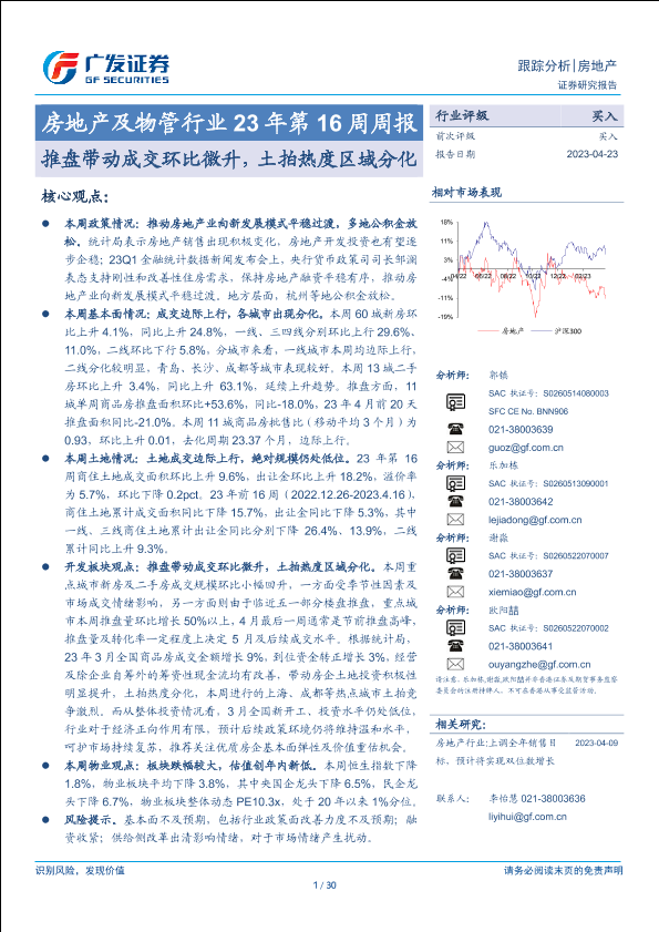 【广发证券】【20230423】房地产及物管行业23年第16周周报:推盘带动成交环比微升,土拍热度区域分化-30页