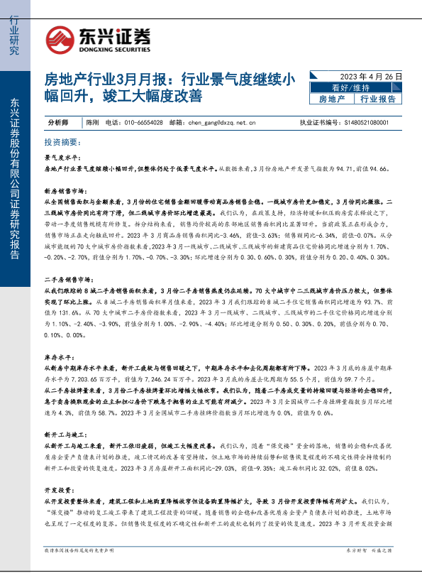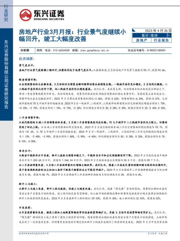 【东兴证券】【20230426】房地产行业3月月报:行业景气度继续小幅回升,竣工大幅度改善-58页