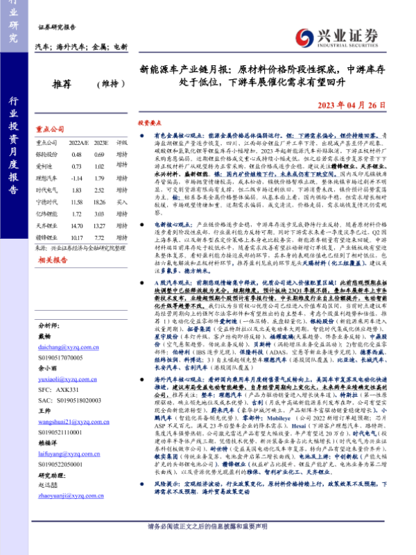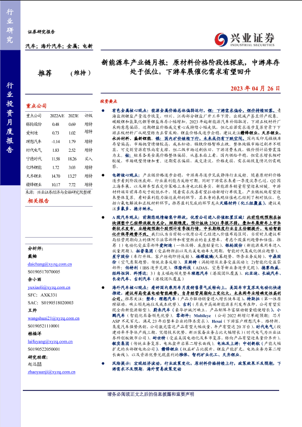 【兴业证券】【20230426】新能源车产业链月报:原材料价格阶段性探底,中游库存处于低位,下游车展催化需求有望回升-41页