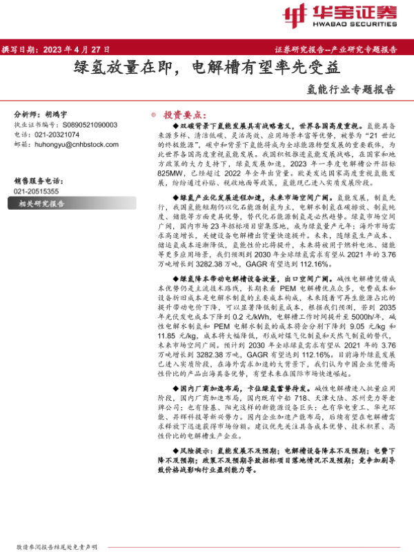 【华宝证券】【20230427】氢能行业专题报告:绿氢放量在即,电解槽有望率先受益-25页