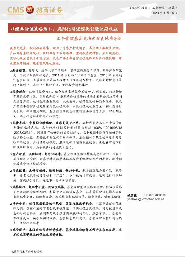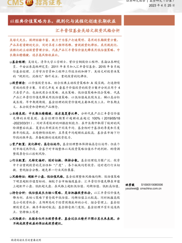 【海通证券】【20230425】汇丰晋信基金吴培文投资风格分析:以经典价值策略为本,规则化与流程化创造长期收益-17页