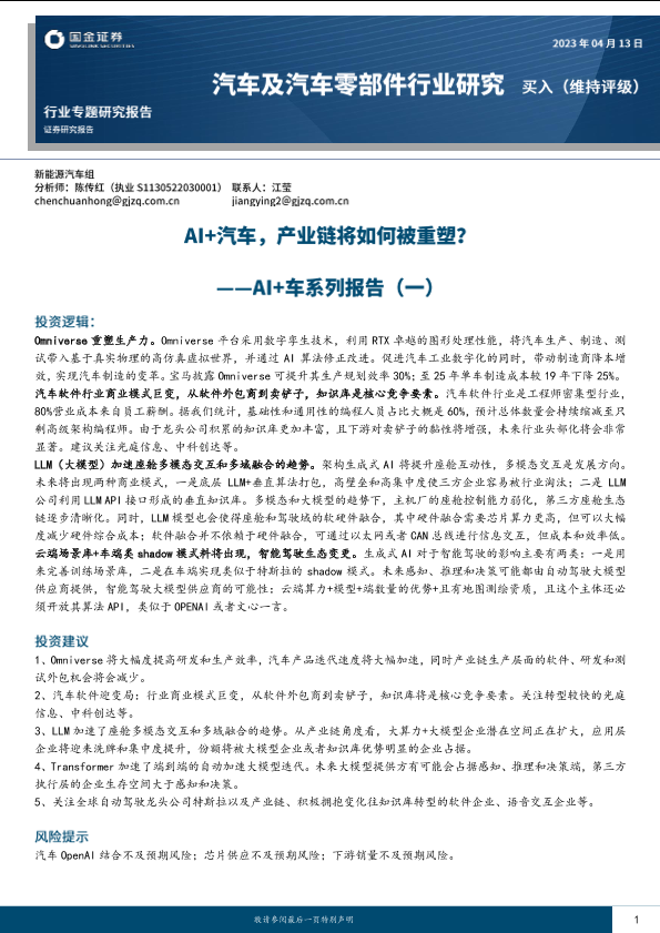 【国金证券】【20230413】汽车及汽车零部件行业AI+车系列报告(一):AI+汽车,产业链将如何被重塑?-16页