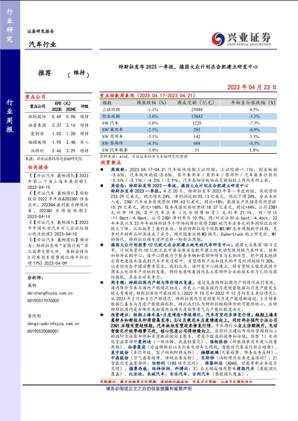 【兴业证券】【20230423】特斯拉发布2023一季报,德国大众计划在合肥建立研发中心-32页