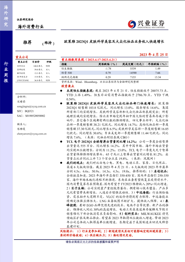【兴业证券】【20230425】欧莱雅 2023Q1皮肤科学美容及大众化妆品业务收入快速增长-17页