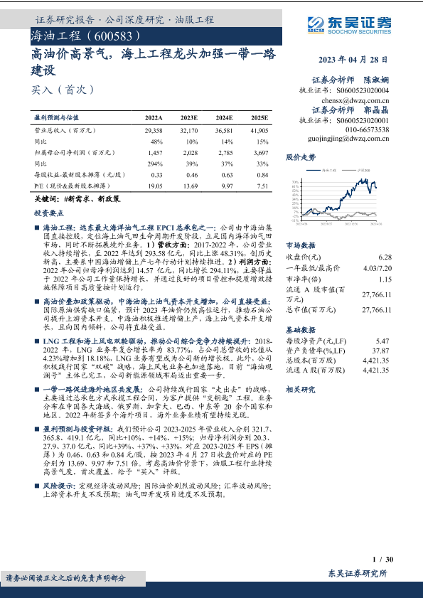 【东吴证券】【20230428】海油工程(600583)高油价高景气,海上工程龙头加强一带一路建设-30页