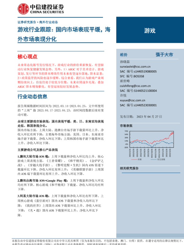 【中信建投证券】【20230427】游戏行业跟踪:国内市场表现平缓,海外市场表现分化-38页