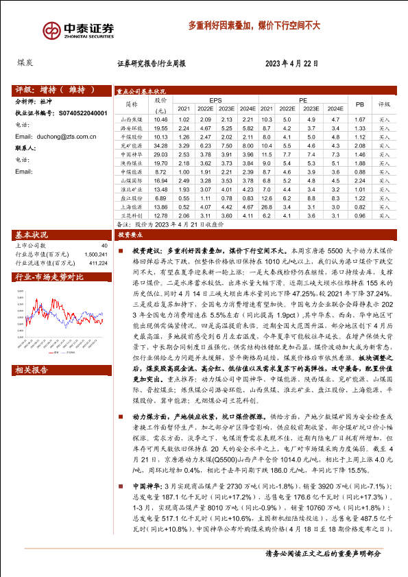 【中泰证券】【20230422】煤炭行业周报:多重利好因素叠加,煤价下行空间不大-27页