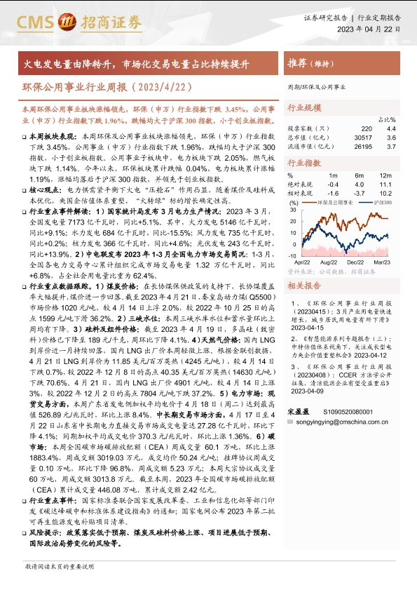 【海通证券】【20230422】环保公用事业行业周报:火电发电量由降转升,市场化交易电量占比持续提升-22页