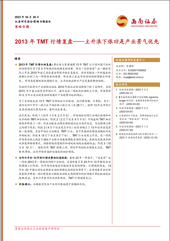 【西南证券】【20230426】策略专题:2013年TMT行情复盘,主升浪下依旧是产业景气优先-28页