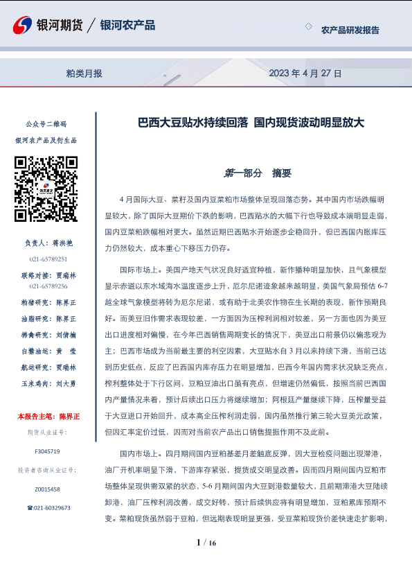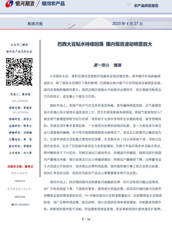 【银河期货】【20230427】粕类月报:巴西大豆贴水持续回落,国内现货波动明显放大-16页