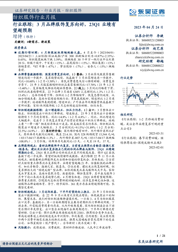 【东吴证券】【20230424】纺织服饰行业月报:3月品牌服饰复苏向好,23Q1业绩有望超预期-21页