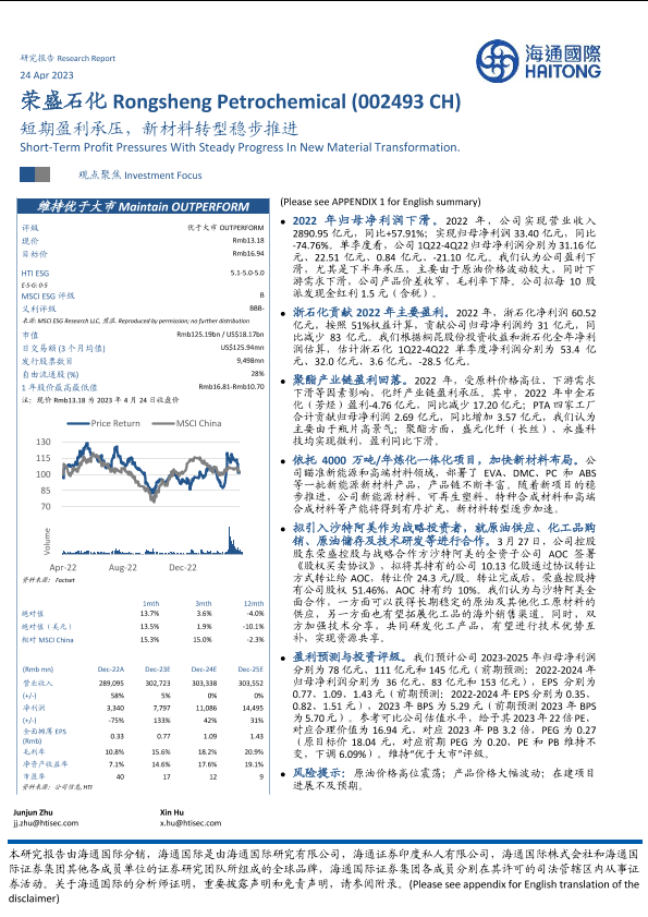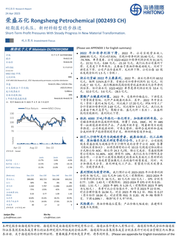 【海通国际】【20230424】荣盛石化(002493)短期盈利承压,新材料转型稳步推进-16页