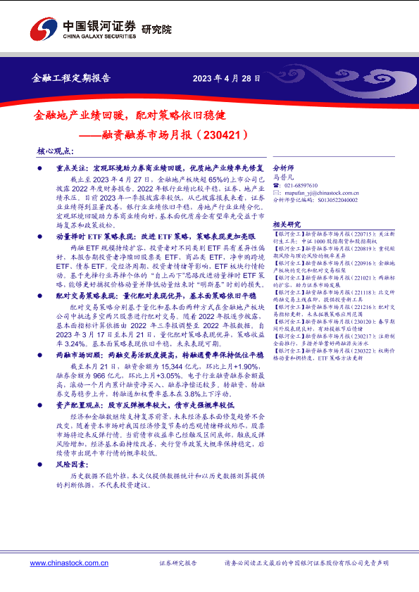 【银河证券】【20230428】融资融券市场月报:金融地产业绩回暖,配对策略依旧稳健-20页