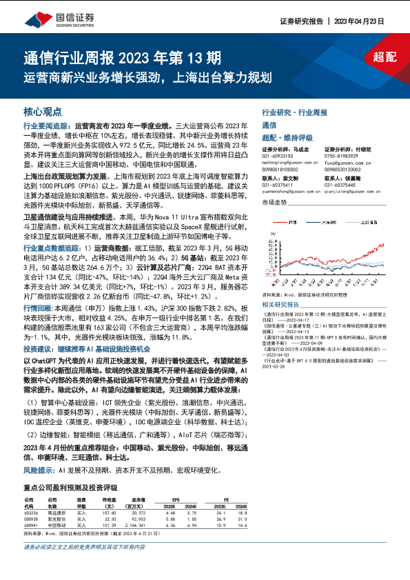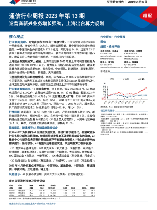 【国信证券】【20230423】通信行业周报2023年第13期:运营商新兴业务增长强劲,上海出台算力规划-33页
