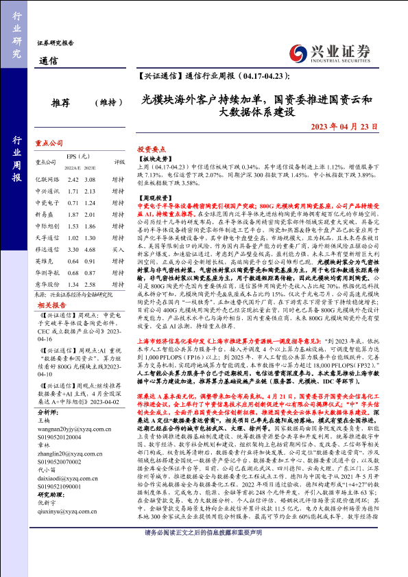 【兴业证券】【20230423】通信行业周报:光模块海外客户持续加单,国资委推进国资云和大数据体系建设-23页