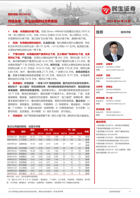 【民生证券】【20230423】钢铁周报:持续去库,关注后续钢材消费表现-20页