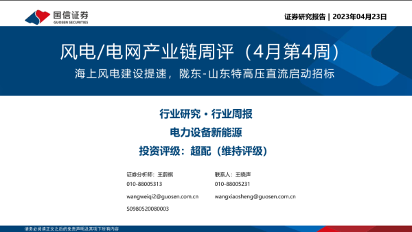 【国信证券】【20230423】风电电网产业链周评(4月第4周):海上风电建设提速,陇东-山东特高压直流启动招标-26页