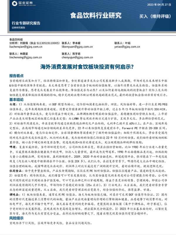 估值框架 投资分析 海外消费 行业发展 食品饮料