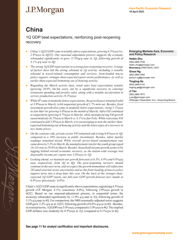 【J.P. Morgan】【20230418】1Q GDP beat expectations, reinforcing post-reopening recovery-14页
