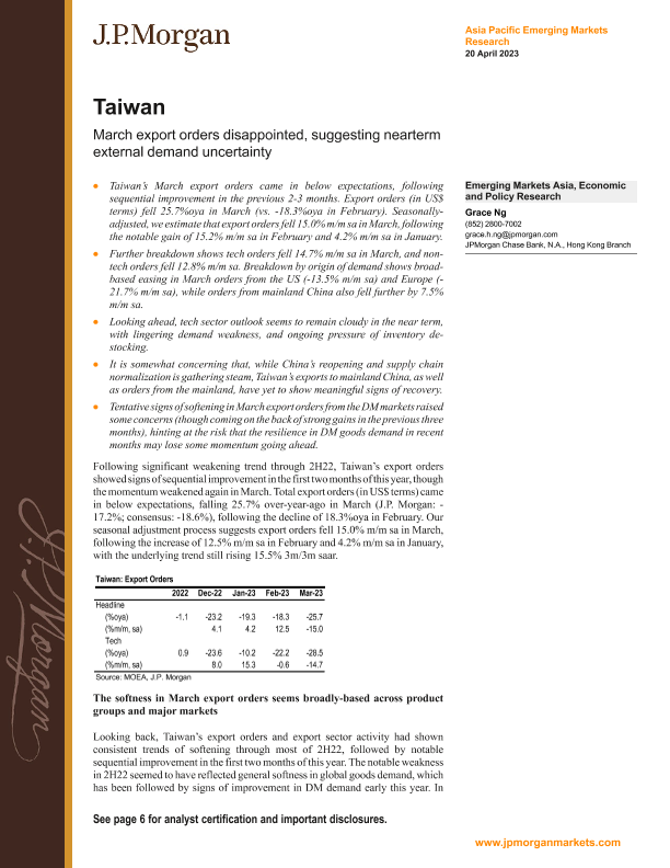 【J.P. Morgan】【20230420】Taiwan March export orders disappointed, suggesting nearterm external demand uncertainty-9页