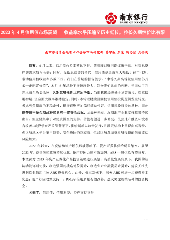 【南京银行资金运营中心】【202304】南京银行-收益率水平压缩至历史低位,拉长久期性价比有限——南京银行2023年4月信用债市场展望-23页