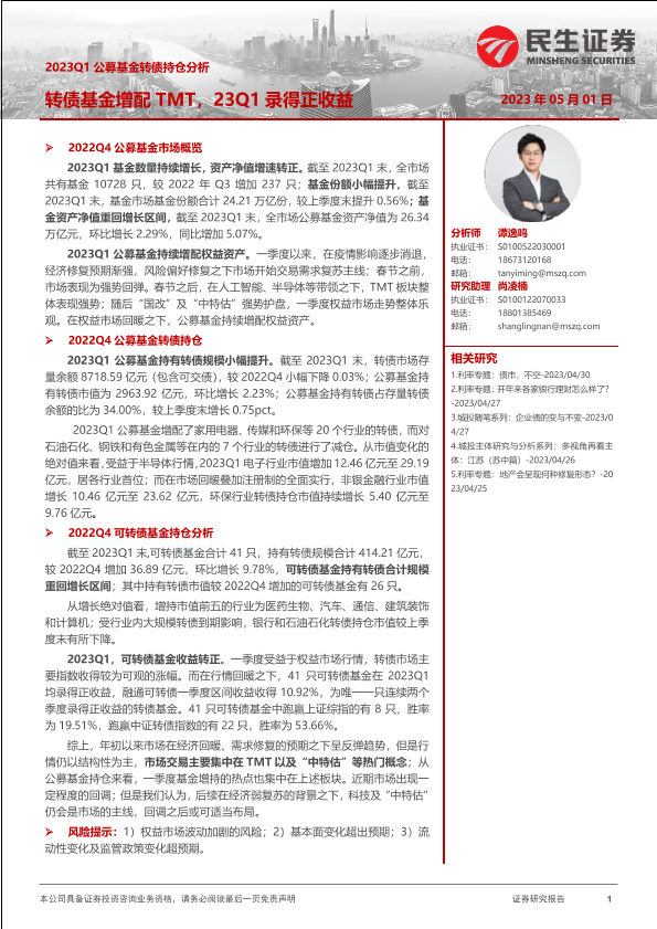 【民生证券】【20230501】2023Q1公募基金转债持仓分析:转债基金增配TMT,23Q1录得正收益-20页