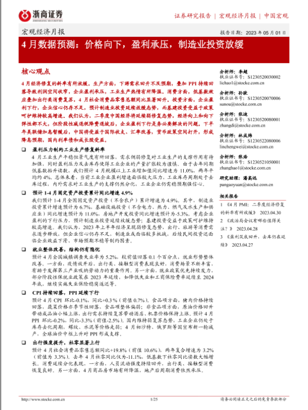 【浙商证券】【20230501】4月数据预测:价格向下,盈利承压,制造业投资放缓-25页