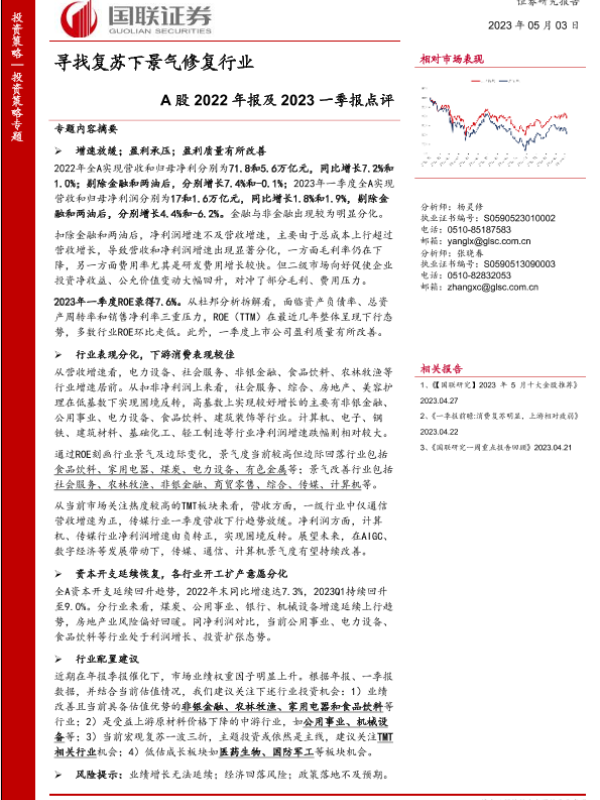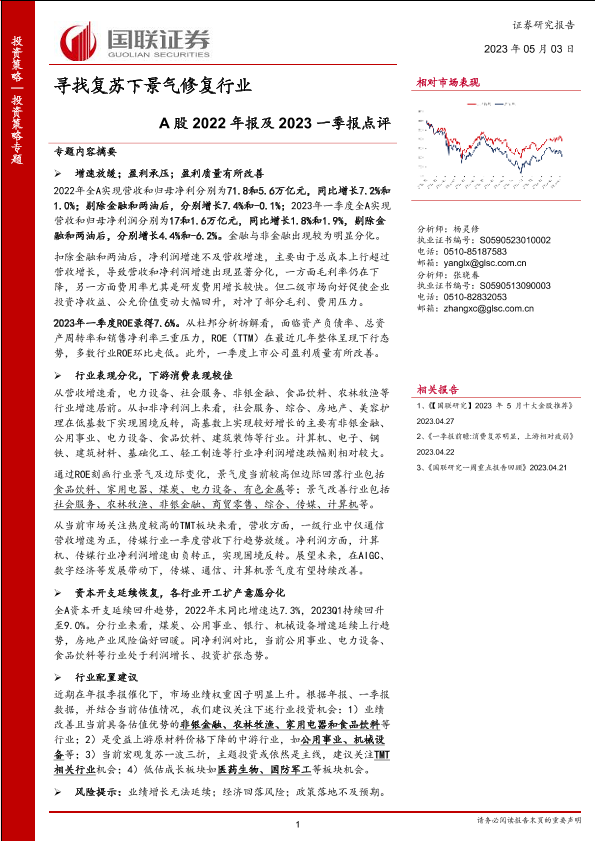 【国联证券】【20230503】A股2022年报及2023一季报点评:寻找复苏下景气修复行业-25页