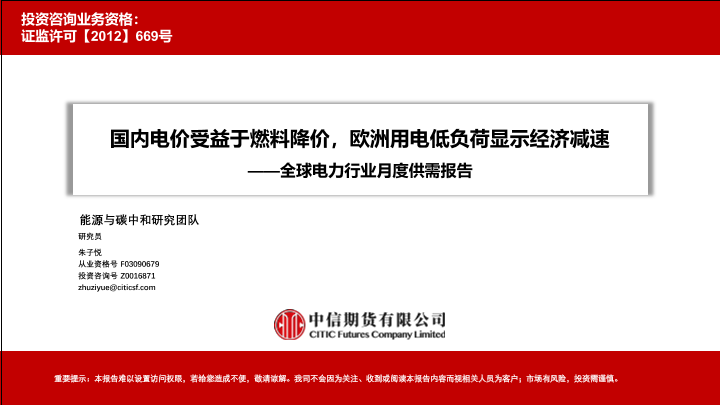 【中信期货】【20230428】全球电力行业月度供需报告:国内电价受益于燃料降价,欧洲用电低负荷显示经济减速-30页
