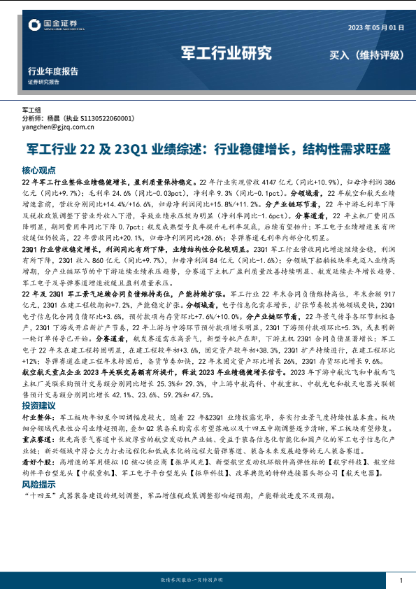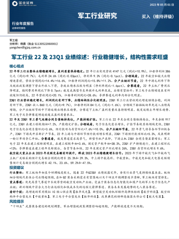 【国金证券】【20230501】军工行业22及23Q1业绩综述:行业稳健增长,结构性需求旺盛-27页