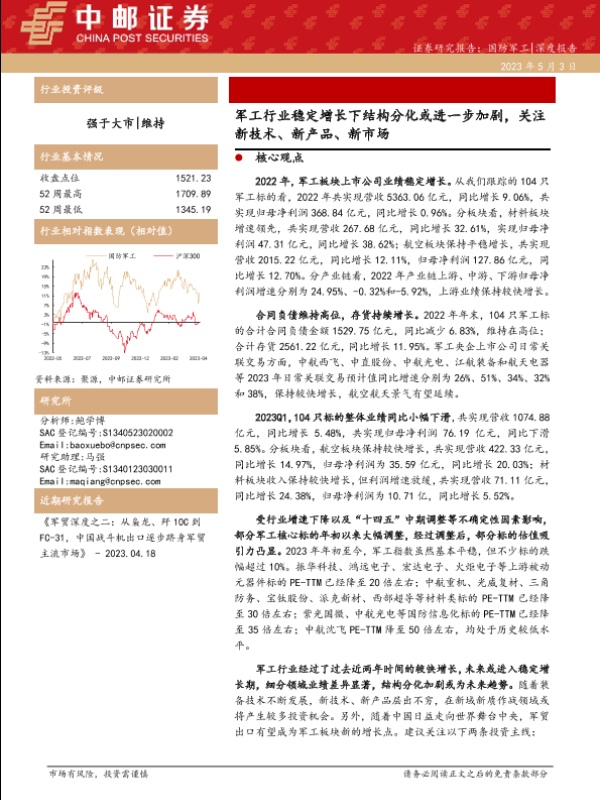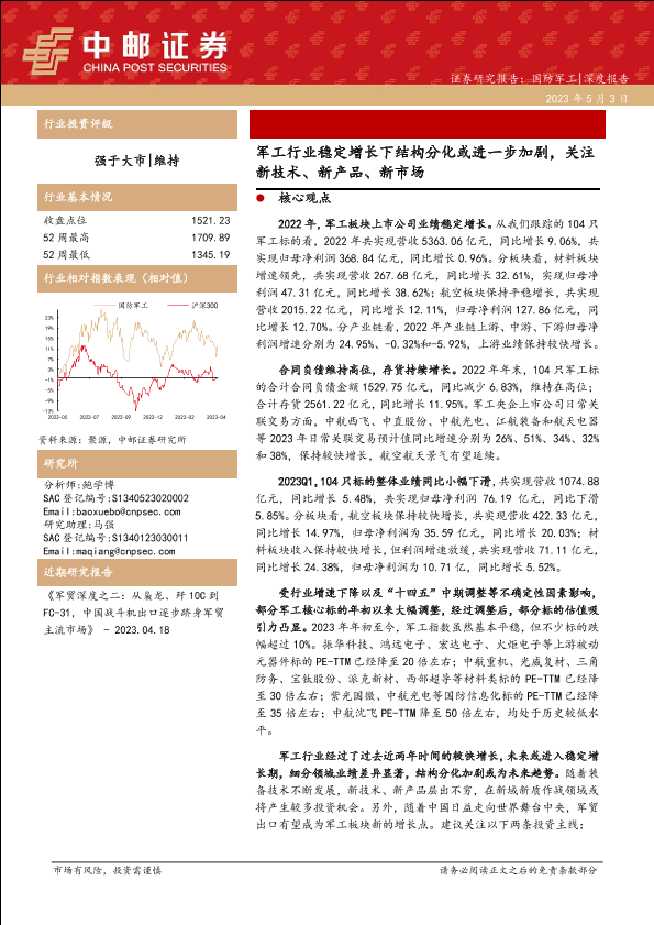 【中邮证券】【20230503】军工行业稳定增长下结构分化或进一步加剧,关注新技术、新产品、新市场-29页