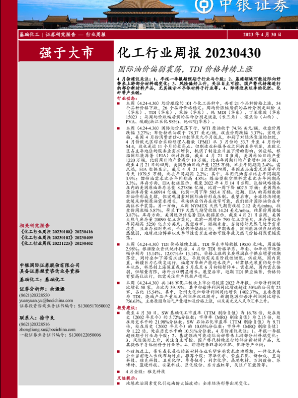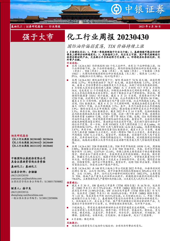 【中银证券】【20230430】化工行业周报:国际油价偏弱震荡,TDI价格持续上涨-21页