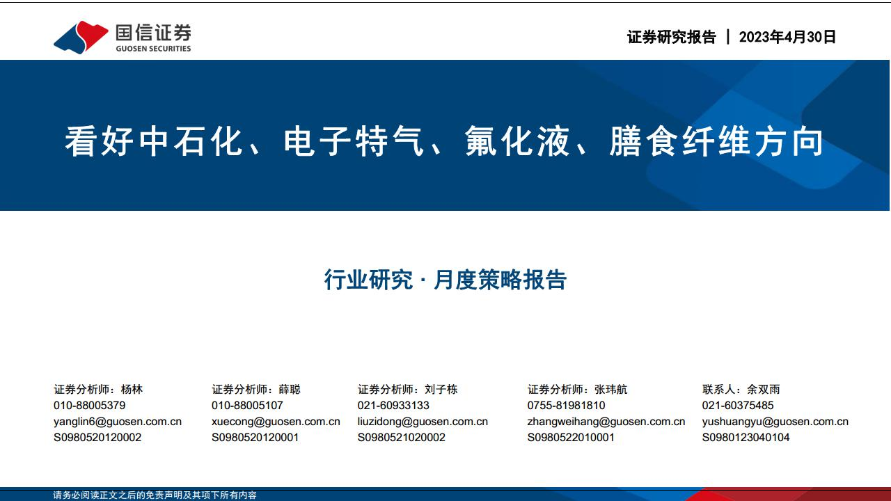 【国信证券】【20230430】化工行业:看好中石化、电子特气、氟化液、膳食纤维方向-40页