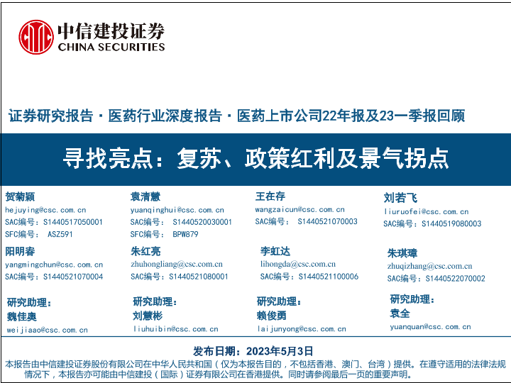 【中信建投证券】【20230503】医药行业深度报告·医药上市公司22年报及23一季报回顾,寻找亮点:复苏、政策红利及景气拐点-116页