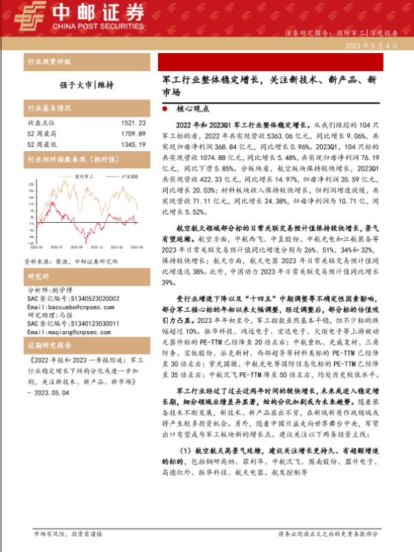 【中邮证券】【20230504】国防军工:军工行业整体稳定增长,关注新技术、新产品、新市场-23页