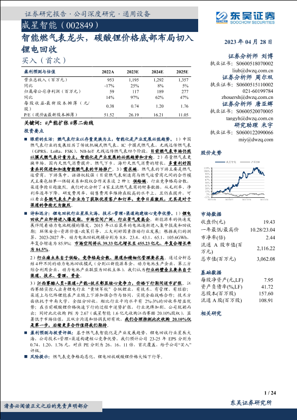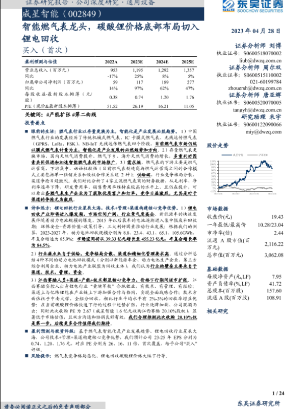 【东吴证券】【20230428】威星智能-002849.SZ-智能燃气表龙头,碳酸锂价格底部布局切入锂电回收-24页